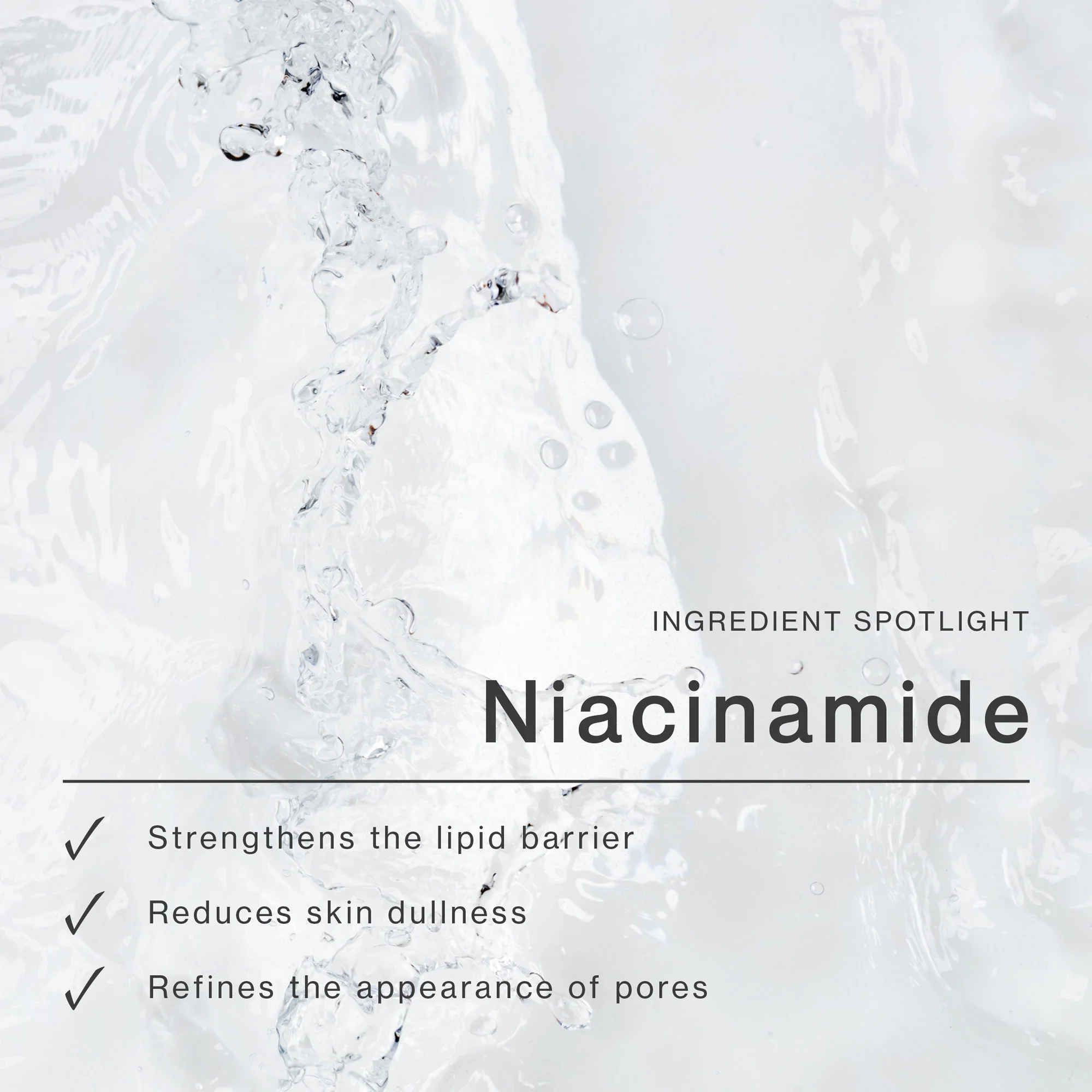 Niacinamide (Vitamin B3) 2%: Strengthens the lipid barrier (the top layer weakens with age), aids in the production of ceramides (help the skin retain moisture), evens skin tone, reduces skin dullness, moisturising and hydrating high in antioxidants. Regulates oil production, unclogs and refines the appearance of pores. Soothes skin and boosts collagen production (softens fine lines and wrinkles). Helps minimise pore appearance, fine lines and wrinkles, regulates sebum, strengthens skin barrier, helps skin look glowy. Protects against sun damage.
